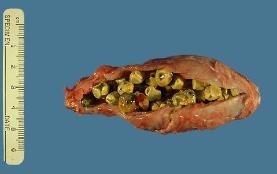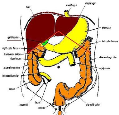 food in the stomach or adjoining small intestine (duodenum). Gall bladder is