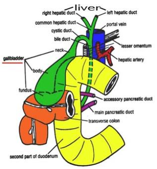 attatched to the side of the bile duct. When the stomach & adjoining small